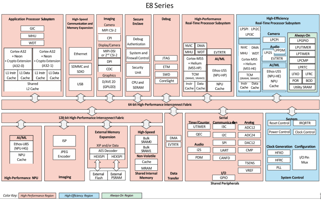 The microcontrollers have dual 800MHz ARMv8 Cortex A32 application cores with a high performance 400MHz ARM M55 microcontroller core with U55 NPU and 160MHz M55 efficiency core with a U55 NPU alongside the 400MHz U85 NPU.