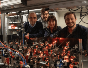 From left to right: researchers Hugues de Riedmatten (group leader), Dario Lago, Jelena Rakonjac, and Samuele Grandi in the lab at ICFO. Image credit: ICFO/ D. Lago
