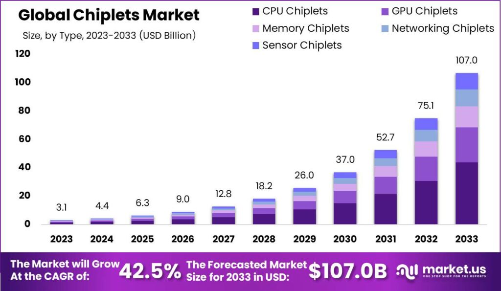 The chiplet market is expected to grow to $107.0bn by 2033, a CAGR compound growth of 42.5%, with $4.4bn predicted for this year.
