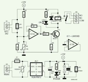 With this simple and small-sized analog design, it is possible to drive any kind of external loads through an insulated set of NO-NC contacts (Normally Open, Normally Closed) of a relay, thus allowing you to control heating devices through the NC connection, or — with reverse logic — to regulate cooling with fans or air conditioning systems through the NO connection.