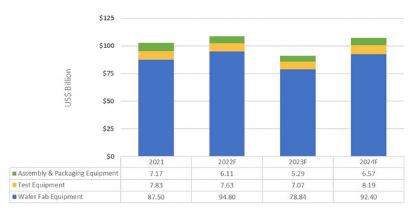The market will reach US$108.5 billion in 2022, an annual rise of 5.9 percent, SEMI forecasts and then in 2023 the market will contract by 16 percent to US$91.2 billion before rebounding in 2024 to US107.2 billion driven by both front-end and back-end segments.