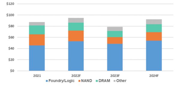 The wafer fab equipment segment, which includes wafer processing, fab facilities, and mask/reticle equipment, is projected to expand 8.3 percent to a new industry record of US$94.8 billion in 2022, followed by a 16.8 percent contraction to US$78.8 billion in 2023 before rebounding 17.2 percent to $92.4 billion in 2024.
