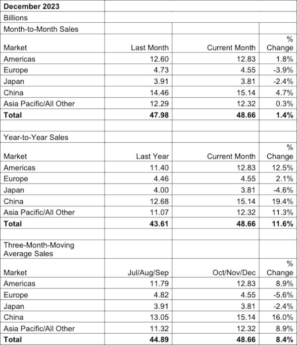 Although the European chip market disappointed in December/4Q23 it was the only regional market that experienced annual growth in 2023, with sales there increasing 4.0 percent. Annual sales into all other regional markets decreased in 2023: Japan (-3.1 percent), the Americas (-5.2 percent), Asia-Pacific/All Other (-10.1 percent), and China (-14.0 percent).