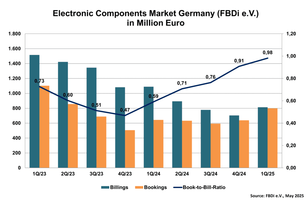 “After a challenging 2024, component distribution in Germany had to cope with a further decline in the first quarter of 2025,” said Andreas Falke, managing director of FBDi. “While external factors will determine whether there will be an upturn or stagnation, companies need to prepare strategically. Bottlenecks are not currently expected, even though order intake indicates a revival in demand. However, geopolitical uncertainties mean that protecting critical supply chains is becoming increasingly important, particularly in the electronics industry where success or failure of production depends on availability of single components.”