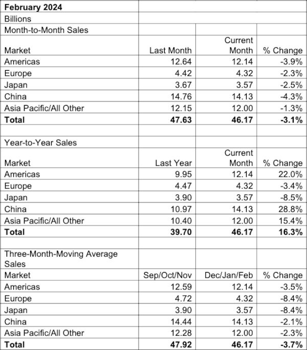 Three-month average of chip sales by geographic region for February and January 2024. Source: SIA/WSTS