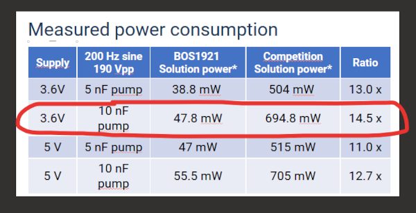 The BOS1921 has a “solution” power consumption of between 40mW and 55mW depending on the micropump capacitance and a factor of between 11 and 14.5 below competitor solutions, the company said. The part has a footprint of 2.1mm by 1.7mm by 0.625mm in a WLSCSP package.