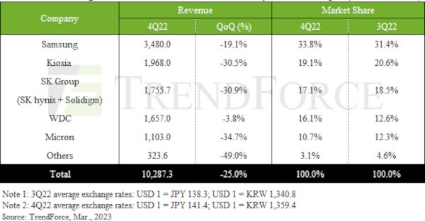 In 4Q22 Kioxia, Micron, SK Hynix lost market share while Samsung and Western Digital gained market share.