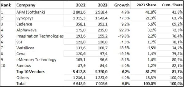 Despite a shrinking chip market, revenues from design IP grew to US$7.04 billion in 2023, an increase of 5.8 percent, according to Eric Esteve of analyst IPnest.
