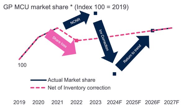 Chart of MCU market share shows the whiplash effect of ST allowing inventories to build at customers. Source: STMicroelectronics.