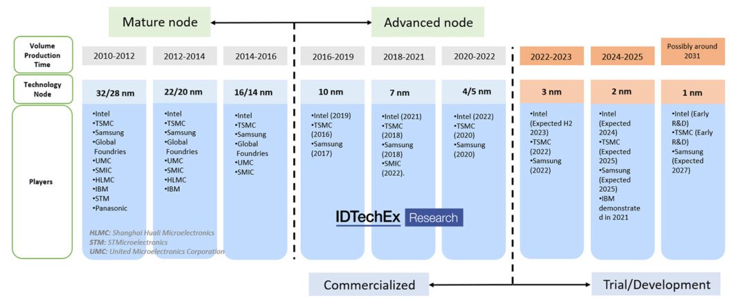 2016 may have been the year that the world first took notice of the reality of AI, but IDTechEx believes that 2020 will be the year that is remembered as a turning point in technology initiatives across the globe. Chips for AI training — where training refers to providing AI algorithms with large datasets, such that the algorithm can adjust its weights in order to better fit with the provided data — are typically at the most leading-edge nodes, given how computationally intensive the training stage of implementing an AI algorithm is. Intel, Samsung and TSMC are the only companies that can produce 5 nm node chips. Of these, TSMC is currently the only company that is having any real success with securing orders for 3 nm chips. TSMC has a global market share for semiconductor production that is currently hovering at around 60%. For the more advanced nodes, this is closer to 90%. Of TSMC’s six 12-inch fabs and six 8-inch fabs, only two are in China and one is in the USA. The rest are in Taiwan. Therefore, the semiconductor manufacture part of the global supply chain is heavily concentrated in the APAC region, principally Taiwan.