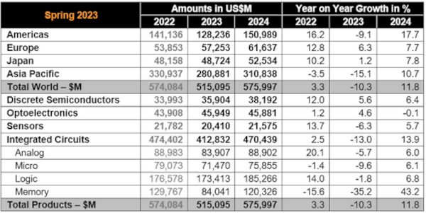 WSTS Spring 2023 forecast summary through 2024. Note: numbers in the table are rounded to whole millions of dollars, which may cause totals by region and by product groups to differ slightly. Source: WSTS.