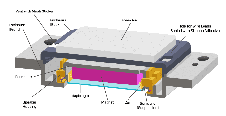 Certains haut-parleurs miniatures sont conçus pour dépendre d’un boîtier arrière afin de fonctionner correctement. Dans ces conceptions, le boîtier fournit une contre-pression essentielle, agissant comme un ressort mécanique, contrôlant le mouvement de la membrane et protégeant les composants internes.