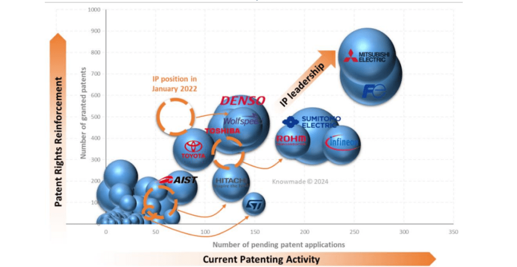 La concurrence croissante sur le marché et les tensions géopolitiques actuelles stimulent les activités de propriété intellectuelle tout au long de la chaîne d’approvisionnement, avec une dynamique intéressante dans les activités de brevets liées aux composants, où Mitsubishi Electric et Fuji Electric dominent.