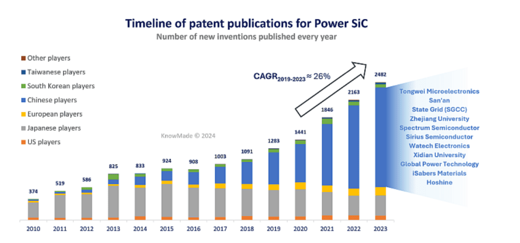 KnowMade étudie la technologie SiC depuis 2018, étendant son analyse des brevets à l’ensemble de la chaîne d’approvisionnement SiC au fil des ans.