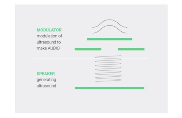 SonicEdge utilise un déflecteur acoustique pour démoduler la porteuse d’ultrasons en produisant des fréquences audio. Source : SonicEdge.