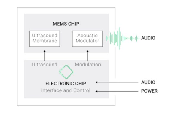 Le premier produit de la société est le SE1000, un ensemble de deux puces comprenant un transducteur ultrasonore MEMS et un démodulateur qui génère le son, ainsi qu’un ASIC qui encode les ultrasons et pilote la puce MEMS.