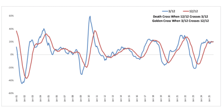 Le graphique clé est la moyenne mobile sur trois mois des ventes de semi-conducteurs par rapport à la moyenne mobile sur 12 mois, qui montre le début du marché en croissance, la « croix d’or », et le marché en déclin, la « croix de la mort ».