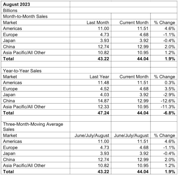 Moyenne sur trois mois des ventes de puces par région géographique pour les mois d’août et de juillet 2023. Source : SIA/WSTS : SIA/WSTS.