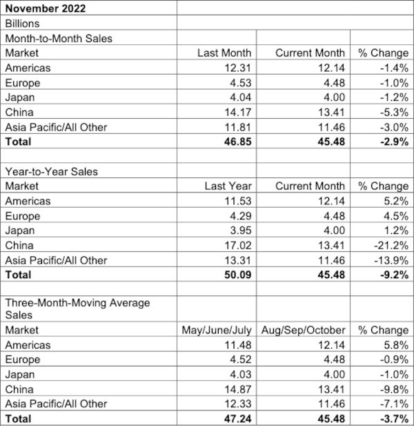 Selon les données de novembre sur les ventes compilées en 3MMA, le marché chinois valait 13,41 milliards de dollars, en baisse de 21,2% par rapport à la même période de l’année précédente. Le marché Asie-Pacifique hors Chine et Japon était évalué à 11,46 milliards de dollars, en baisse de 13,9%. La région des Amériques a augmenté de 5,2 % sur un an, l’Europe de 4,5 % et le Japon de 1,2 %. On ne sait toujours pas si ces régions de marché peuvent éviter une récession du marché des semiconducteurs.