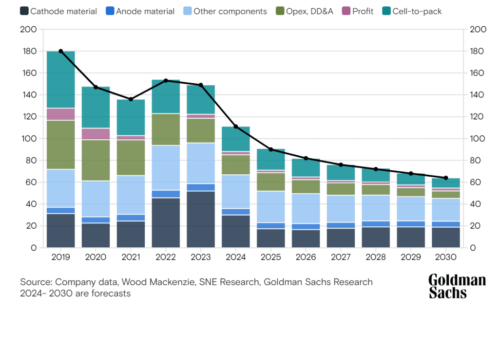 Les prix moyens mondiaux des batteries sont passés de 153 dollars par kilowattheure (kWh) en 2022 à 149 dollars en 2023, et Goldman Sachs Research prévoit qu’ils tomberont à 111 dollars d’ici à la fin de 2024.