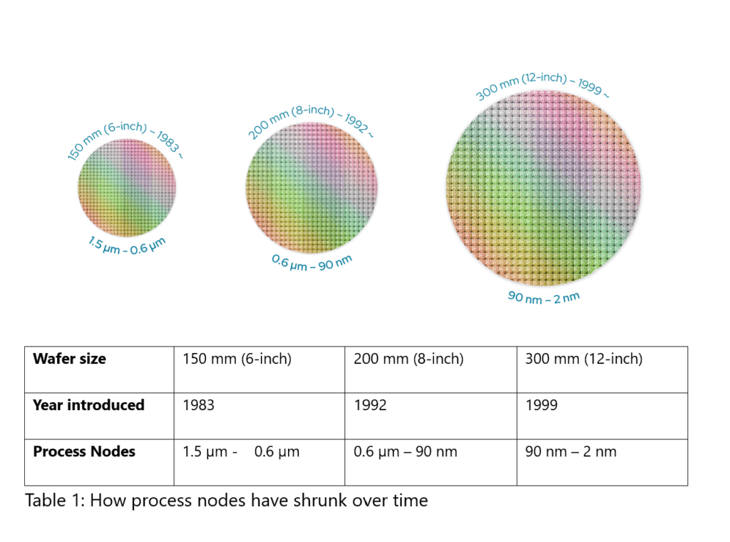 Parallèlement à la réduction de la taille des nœuds de processus, la taille des plaquettes est passée de 150 mm (6 pouces) à 200 mm (8 pouces) et enfin à 300 mm (12 pouces). Outre la loi de Moore, cette augmentation de la taille a contribué de manière décisive à satisfaire la demande croissante de puces tout en réduisant les coûts. Alors que les plaquettes de 300 mm sont devenues la norme pour les nœuds avancés (<90 nm), de nombreuses applications analogiques et à signaux mixtes sont restées sur des plaquettes de 150 mm utilisant des nœuds matures tels que 0,6 µm (voir tableau 1).