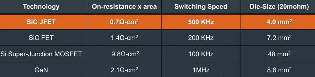 Les JFET SiC offrent la plus faible résistance à l’enclenchement par zone de puce, utilisant moins de la moitié de toute autre technologie, et sont souvent utilisés avec des MOSFET en silicium dans une configuration en cascade. Cela offre également une vitesse de commutation plus élevée, jusqu’à 500 kHz, ce qui permet des transformateurs plus petits et une densité de puissance plus élevée.