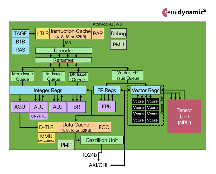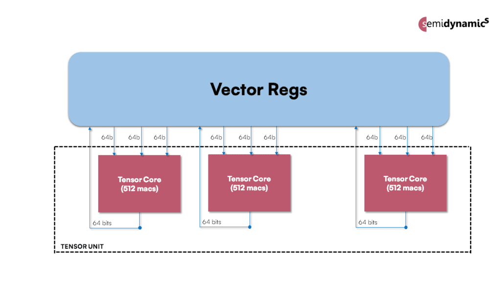 Le Tensor Unit utilise à la fois les capacités de l’unité vectorielle et celles de l’unité centrale Atrevido-423 Gazzillion pour extraire de la mémoire les données dont elle a besoin. Les performances du cœur de l’unité centrale 64 bits font qu’un accès direct à la mémoire (DMA) n’est pas nécessaire pour gérer le flux de données. Comme l’unité de tenseur utilise les registres vectoriels pour stocker ses données et qu’elle n’inclut pas de nouvel état architecturalement visible, elle peut fonctionner avec n’importe quel Linux RISC-V vectoriel sans aucune modification.