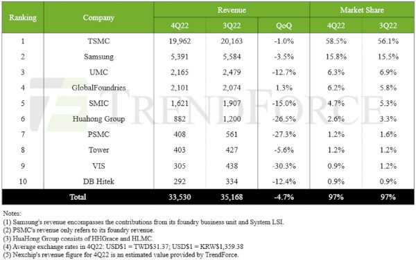 L’analyste de marché estime que le marché de la fonderie valait 34,57 milliards de dollars au 4T22, en baisse de 4,7% par rapport aux 36,26 milliards de dollars du trimestre précédent. Les dix premières fonderies étaient responsables de 97 % de ces ventes. Dans ce classement, TrendForce estime que la baisse séquentielle a été mineure chez Samsung et TSMC et en hausse ches Global Foundries, permettant à ces trois sociétés de gagner des parts de marché.